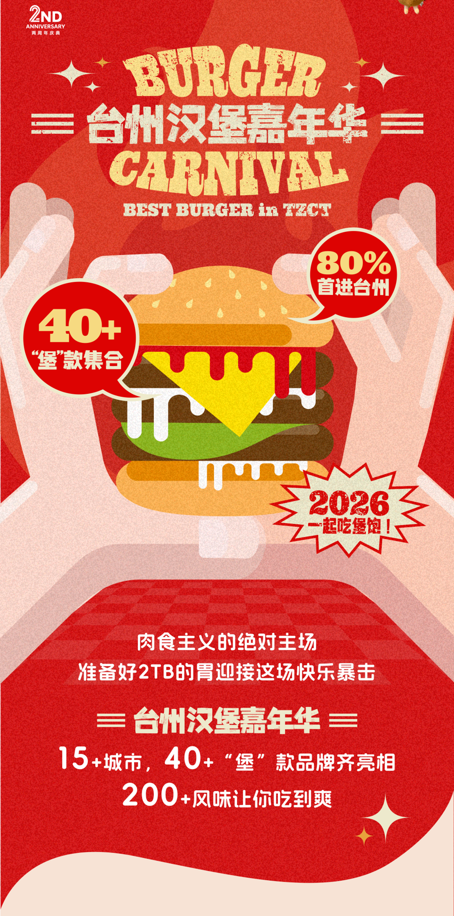 活动内容:召集全国范围知名汉堡品牌40+,聚集路桥南官新天地,将各省市特色风味汉堡产品带到台州,现场设置活动打卡、文艺演出等精彩内容。